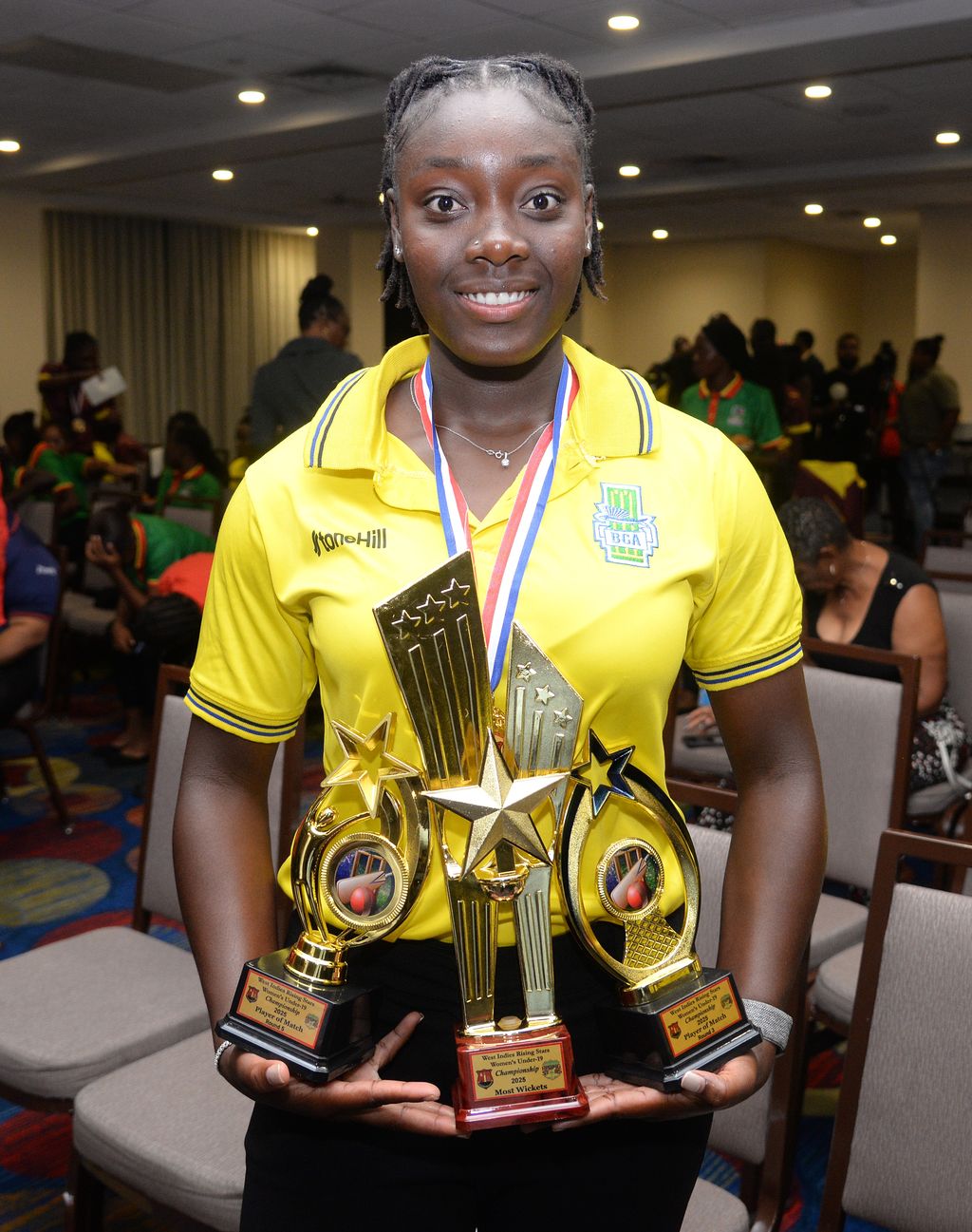 Arima Boys’ RC’s Zachiel Smith poses with the MVP trophy after being named the top player and the Championship trophy in the boys’ U-15 category in the Trinidad Leg of the National Primary Schools Football League Finals at the Ato Boldon Stadium in Couva, on Wednesday.